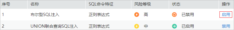 禁用SQL注入檢測規則后,如果您需要啟動該規則,請在SQL注入檢測規則所在行的“操作”列,單擊“啟用”,如下圖所示,啟用該規則。