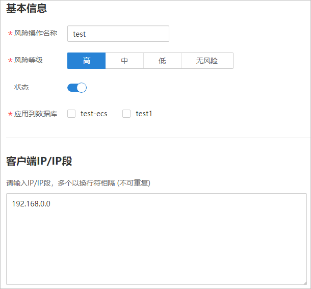 - 在“添加風險操作”界面,設置基本信息和客戶端IP地址,如下圖所示,相關參數說明如下表所示。