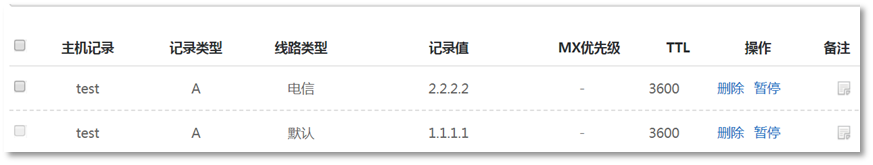 例如 test. daliqc.cn 設置“默認”線路解析到1.1.1.1,“電信”線路解析到2.2.2.2,則電信運營商用戶訪問將返回2.2.2.2的 IP 地址,非電信運營商用戶訪問將返回1.1.1.1的 IP 地址。