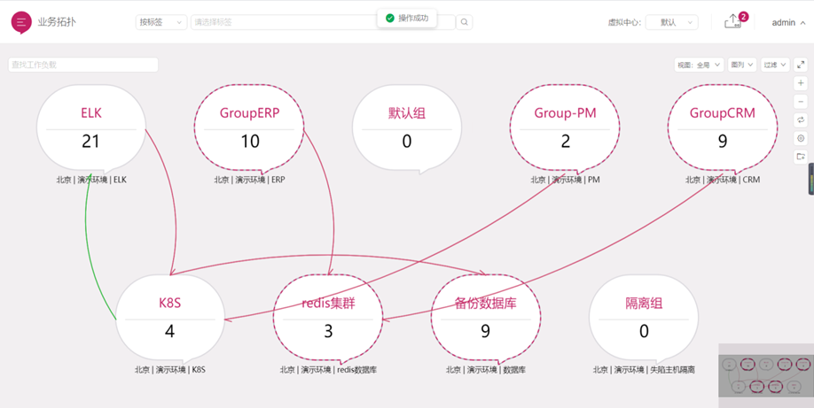 由于工作負載帶有業務角色屬性,所以非常有利于基于學習到的連接關系生成一張綜合的可視化視圖,可以直觀呈現環境間、業務間、工作組間、工作負載間的互訪關系。基于此能力,實現如下價值:
