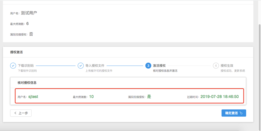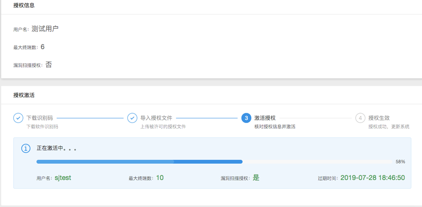 收到授權文件后選擇“導入授權文件”,并拖動相關授權文件進行上傳,上傳成功后進行“用戶名”、“最大終端數”、“漏洞掃描授權”、“過期時間”等信息,確定無誤后進行授權激活。