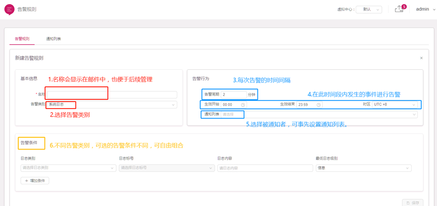 進入告警規則界面后,可配置告警相關信息(郵件服務器地址需超級管理員用戶在系統管理中設置)。根據下圖步驟可完成告警規則的配置。