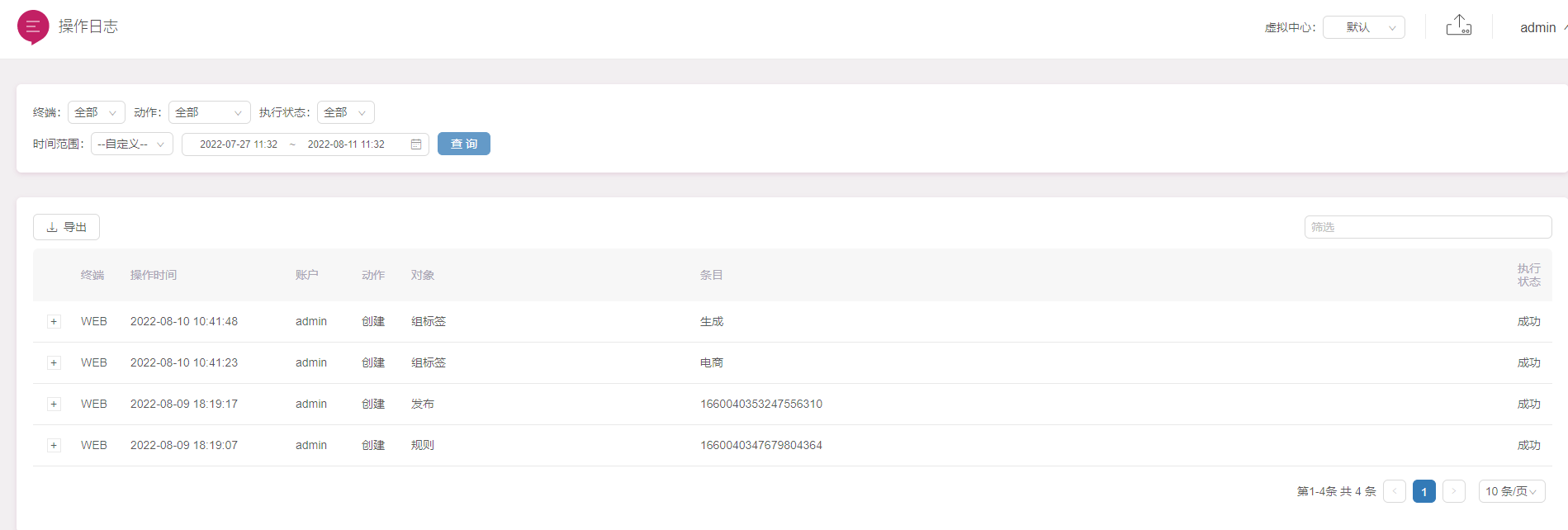 操作日志會記錄用戶的操作(包括Web頁面及API),例如工作組的創建、策略的生成等等。用戶可根據篩選條件查看對應的操作日志。