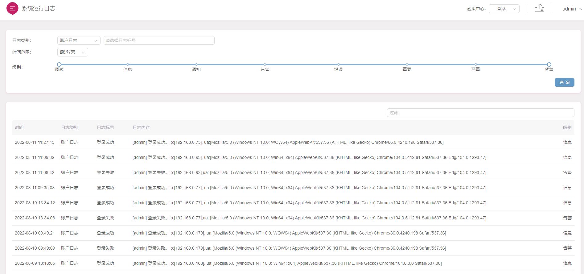 系統日志界面會記錄系統的運行信息以及工作負載狀態信息。可用于查看系統運行狀態,工作負載運行狀態,策略是否生效等。