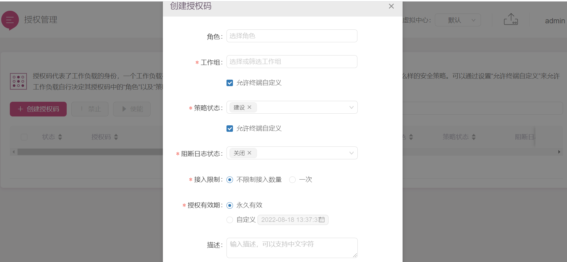 授權碼代表了工作負載的身份,一個工作負載在接入系統時,系統將根據其授權碼決定是否允許其接入、配置什么樣的安全策略、分配到哪個工作組等。