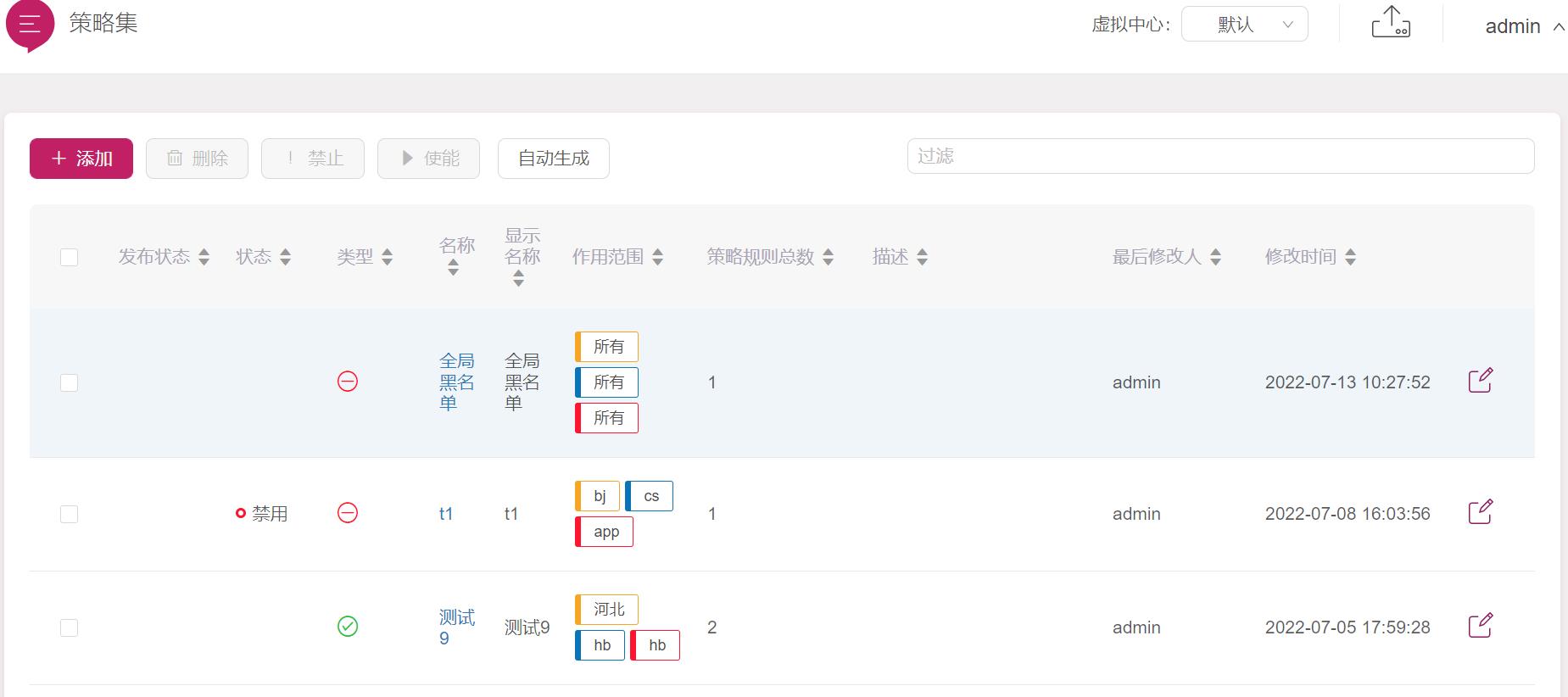 1.策略與策略集用于策略的建立、修改、刪除、禁止與使能。可通過頁面的搜索框進行過濾;每條策略最右側的