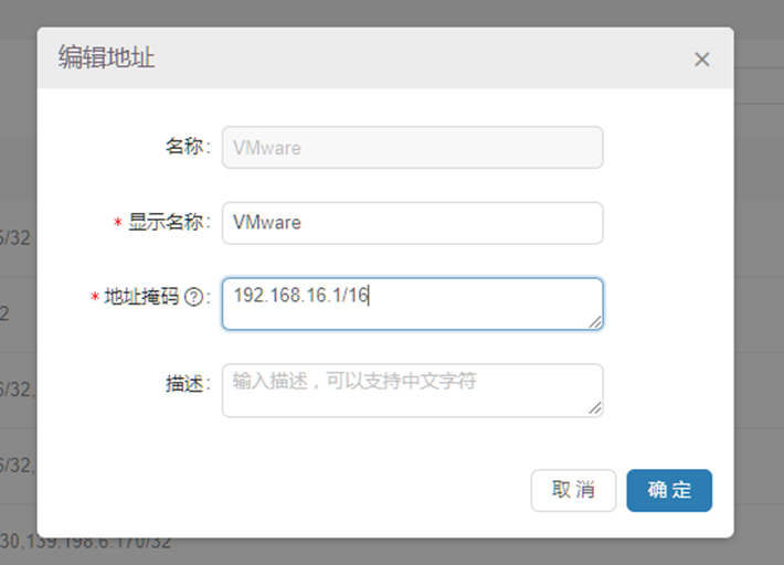 標識,可新建一條地址對象。地址對象名稱唯一,需注意地址的書寫格式,IP段用IP地址加掩碼表示,如果為單個IP地址也需標注32位掩碼,多個地址中間用逗號隔開。