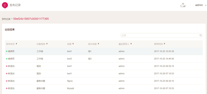 點擊每條發布記錄最右側的 ,即可進入比較頁面,本頁面會顯示本條發布記錄時與現有策略的差別項。