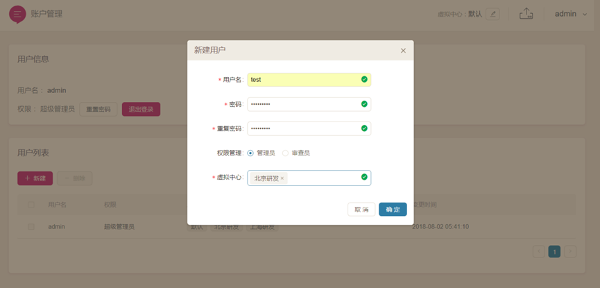1.點擊賬戶管理,即可進入賬戶管理頁面,賬戶管理頁面可查看用戶登錄信息,新增用戶、修改密碼等操作。