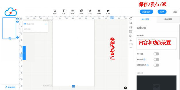 進入新建模板頁面后,可利用右上方的設置欄功能進行模板制作。