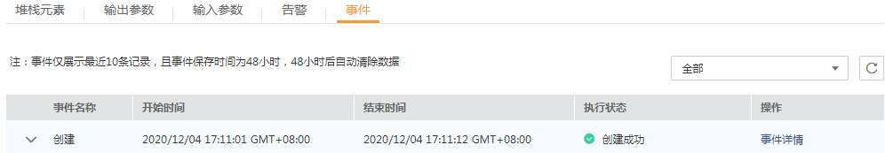 注:事件僅展示最近10條記錄,且事件保存時間為48小時,48小時后自動清除數據。