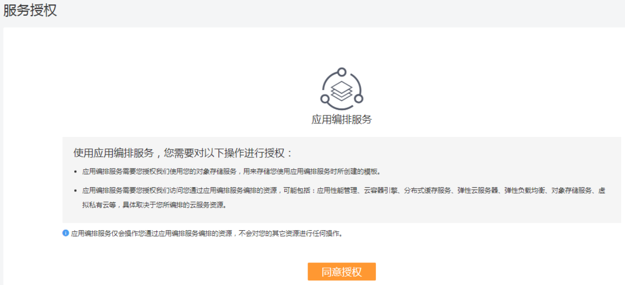 首次進入應用編排服務的控制臺時,會提示該服務涉及相關基礎服務的授權。