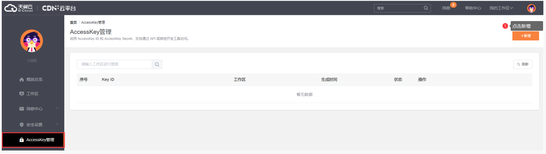 2.在個人中心AccessKey管理頁面,點擊新增按鈕。