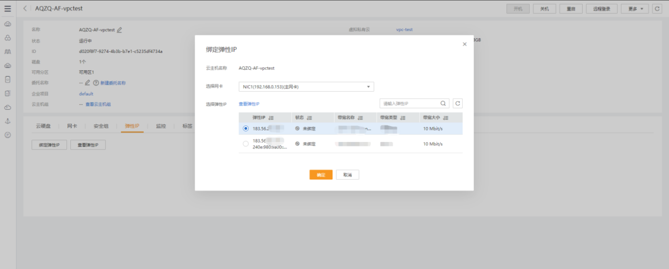 2.點擊云防火墻云主機(AQZQ-AF-**),進入【彈性IP】→【綁定彈性IP】,將彈性IP重新綁定到防火墻云主機的NIC1主網卡上。(**表示主機名稱)