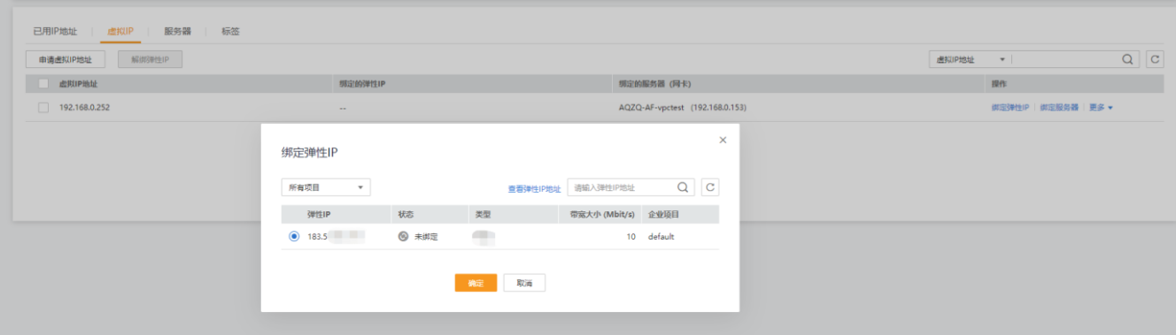 3.如有多個彈性IP地址,請通過云防火墻的虛擬IP地址綁定,點擊(AQZQ-AF-**)的云主機,進入【網卡】→【管理虛擬IP地址】→【綁定彈性IP】。