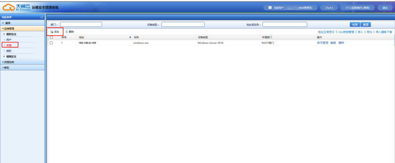 1.點擊【運維(wei)管(guan)理(li)】→【資(zi)源】→【添(tian)加】,可以添(tian)加不同類型的運維(wei)資(zi)源。