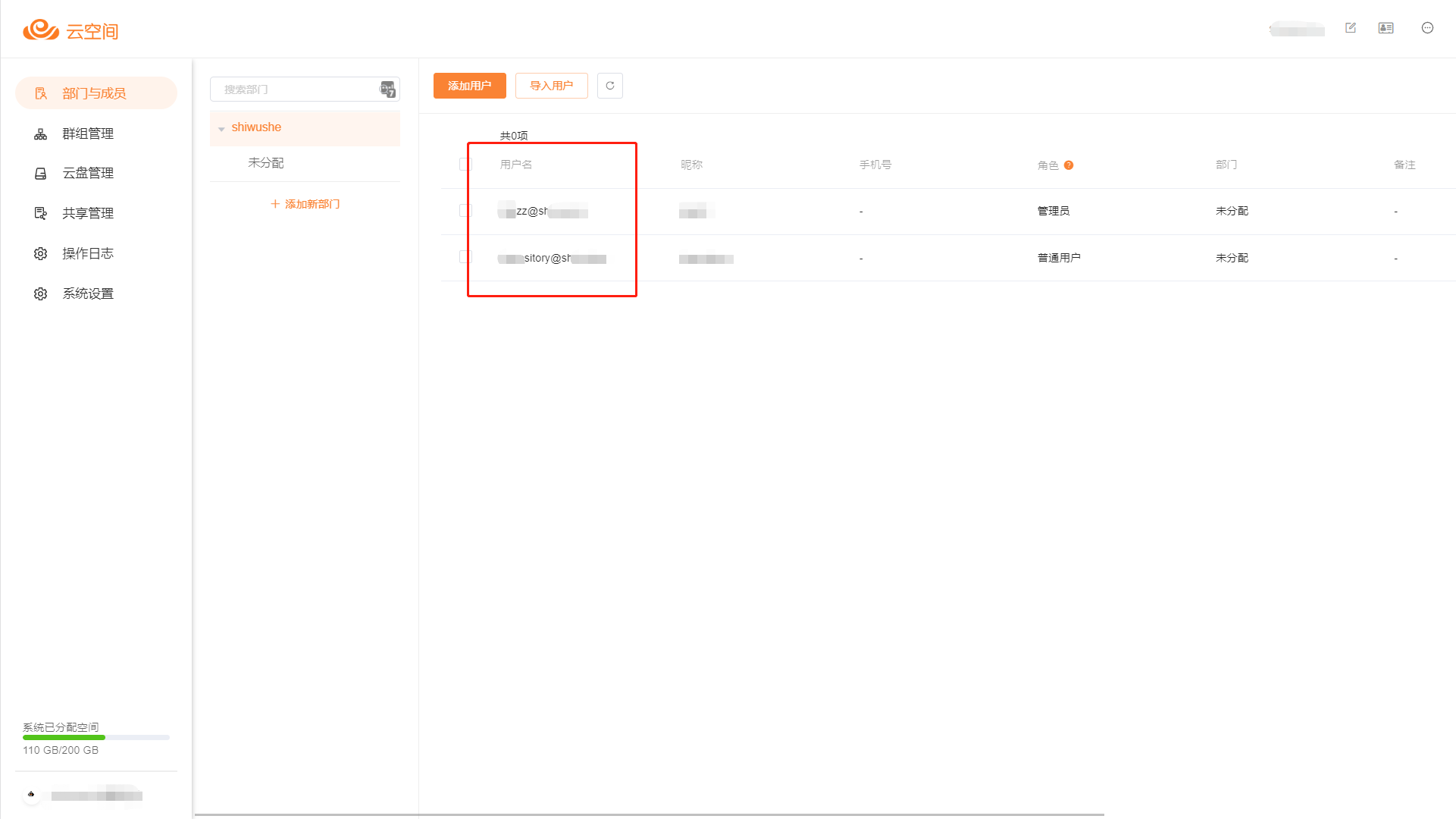 在Web BasicUI的【用戶管理頁】中,點擊【添加用戶】,在彈框中輸入用戶名、密碼、昵稱,選擇普通用戶角色或者管理員角色,同步分配云盤并設置云盤大小,點擊【確定】即可為空間添加用戶賬號。添加完成后,用戶名被設置為“用戶名@空間名”。