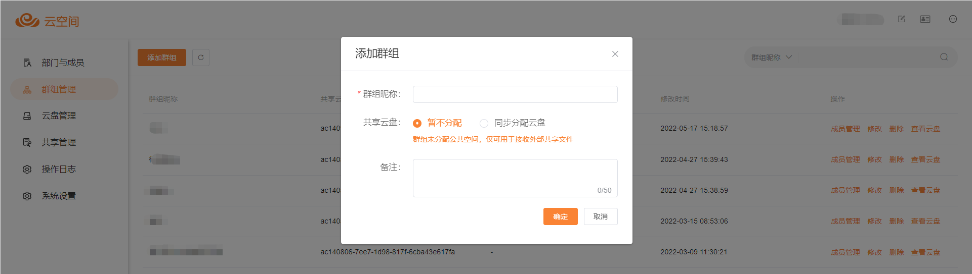 添加群組時可選擇暫不分配共享云盤,僅用于接收共享文件,待需要時再新增分配共享空間。