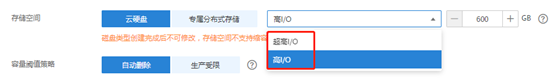 7)選擇存儲空間:此處有2種存儲可以選擇,分別是公有云的云硬盤、專屬分布式存儲。存儲的類型均支持高IO、超高IO。