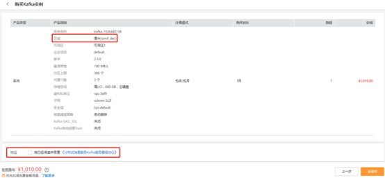 12)點擊“立即購買”,進入支付前規格確認界面。顯示詳細kafka 實例信息,價格。