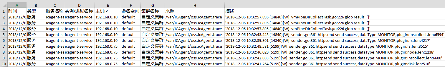 支持以CSV格式和TXT格式導出日志,您可根據需求靈活選擇。CSV格式可導出日志的內容、主機IP、來源等詳細信息。TXT格式只能導出日志的內容,每行為一條日志,如果單條日志內容較多時建議使用Notepad++編輯器打開。