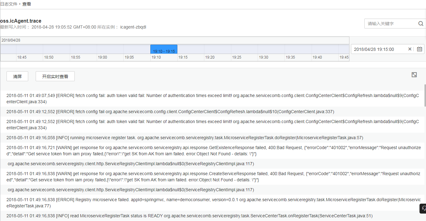 ,選擇日期。時間范圍 單擊時間軸藍色部分,設置日志的時間范圍。時間軸每次只能選擇一個單位時間為5分鐘。 查看日志文件詳情 清屏 單擊“清屏”,可清除屏幕當前已顯示的日志。清屏功能只會清除屏幕當前已顯示的日志,不會刪除日志。 查看實時日志 查看實時日志功能默認關閉,可單擊“開啟實時查看”開啟。開啟后,可查看從當前時刻起,最新寫入的日志。