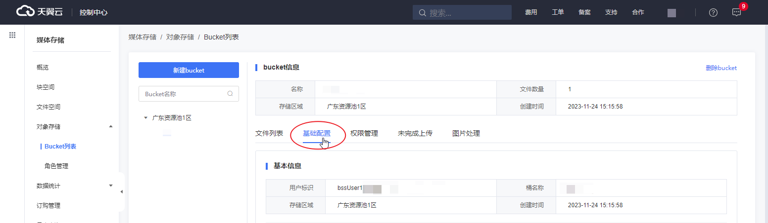 - 選擇需要配置鏡像回源的存儲桶,并點擊【基礎配置】頁簽。