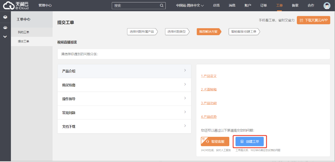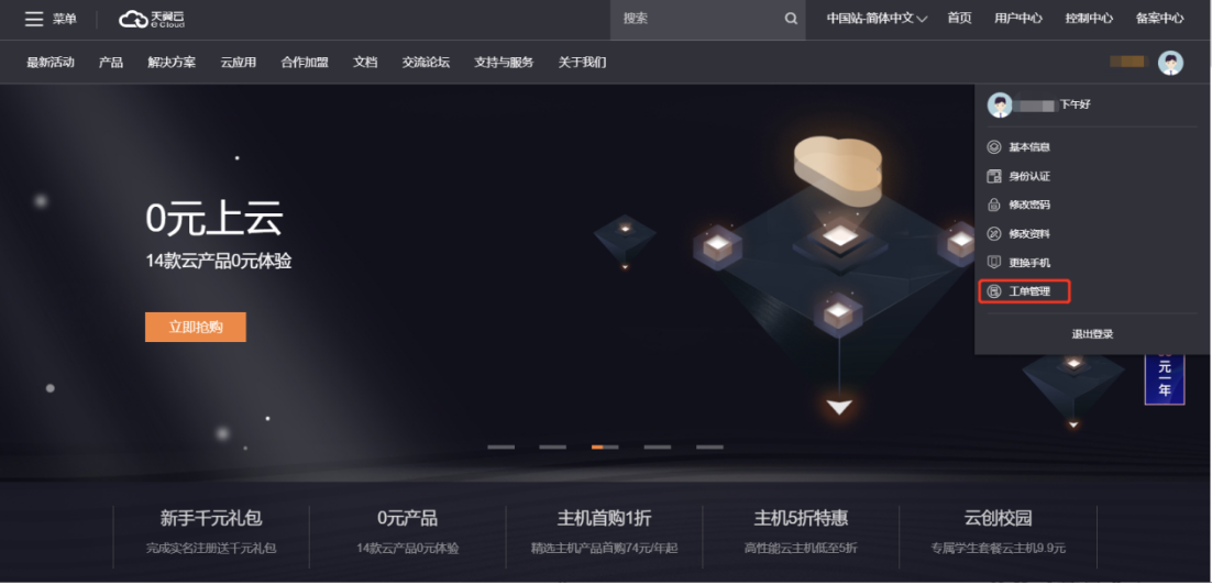 【步驟一】登陸天翼云官網,點擊用戶菜單下的“工單管理“。