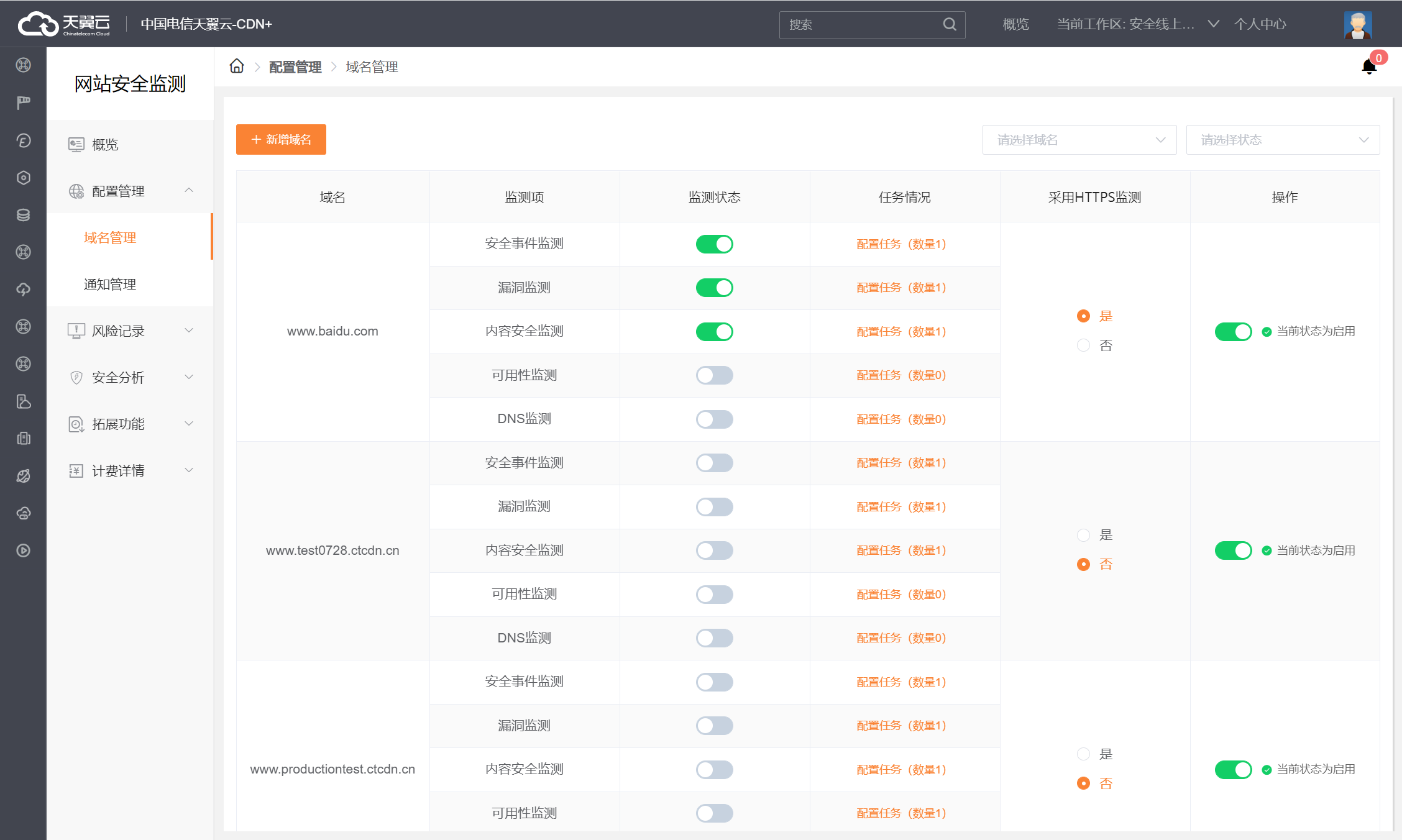 進入網站安全監測客戶控制臺配置管理模塊,選擇【域名管理】即可進入域名管理頁面,在此頁面您可以新增域名,或查看、編輯已添加的域名的信息,包括對應域名的監測項任務配置情況、監測狀態、是否采用HTTPS監測和啟用/關停開關。