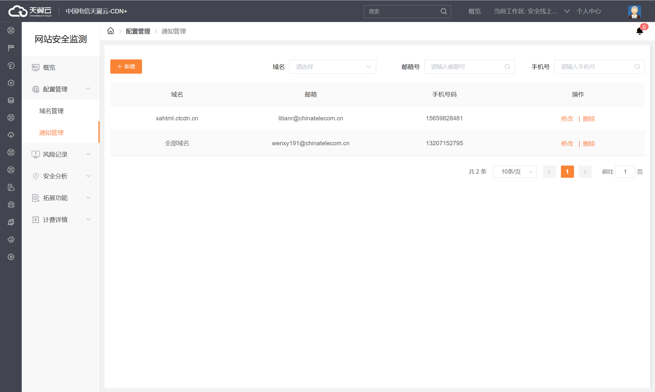 在【通知管理】中查看通知管理列表,可以查看已添加的域名對應通知郵箱、手機號碼,和對應操作修改或刪除。