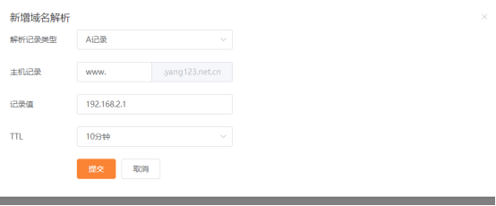 4、在新增解析界面,選擇解析記錄類型以及對應的相關內容,點擊“提交”。即可完成域名的解析。