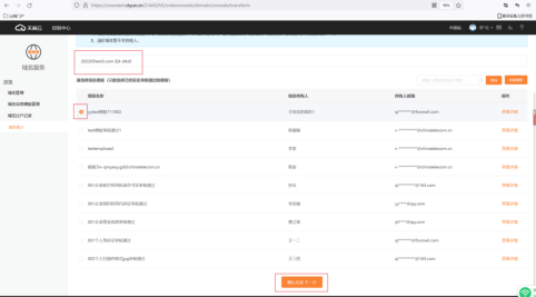 2、輸入需要轉入的域名和轉移密碼,并選擇一個已經實名認證通過的模板,點擊“確認無誤下一步”