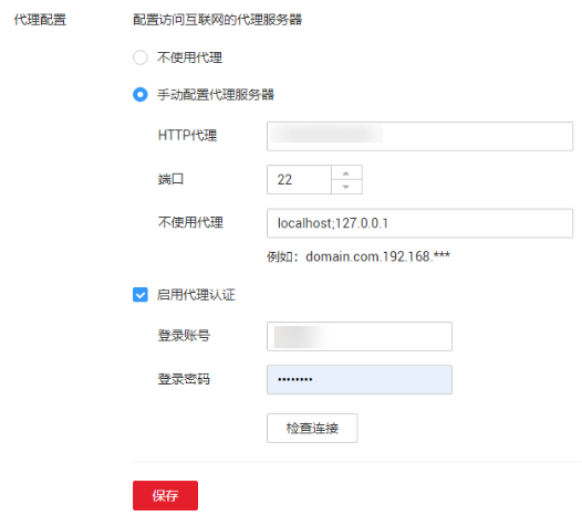 選擇“ 手動配置代理服務器 ”和“ 啟用代理認證 ”并輸入相應的代理地址和登錄賬號、密碼,單擊“ 保存 ”。