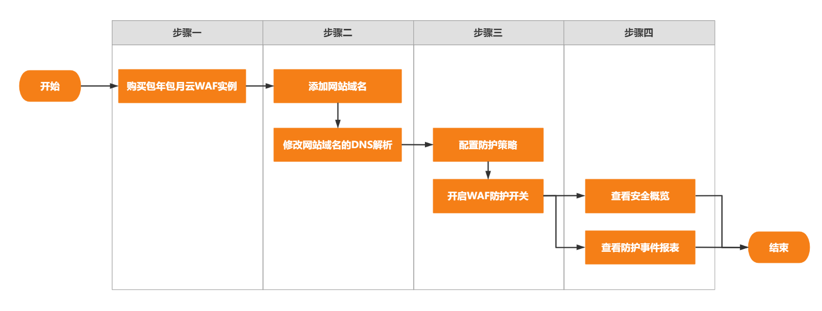 為快速實現Web應用防護,您需要購買WAF實例、完成網站接入并配置防護策略。防護開啟后,可通過安全總覽、防護事件報表查看訪問統計信息和攻擊防護記錄,掌握業務的安全狀況。
