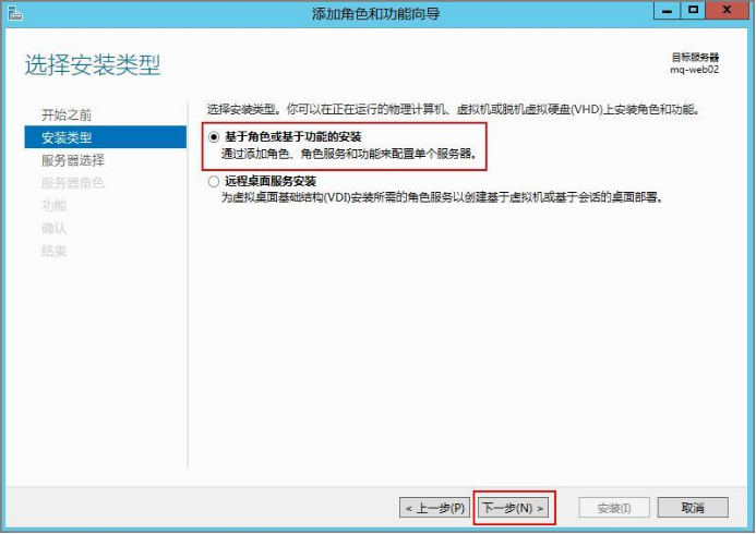 - 選擇“基于角色或基于功能的安裝”,單擊“下一步”。
