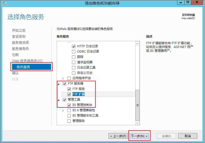 - 選擇“FTP服務器” 以及“IIS管理控制臺”,單擊“下一步”。
