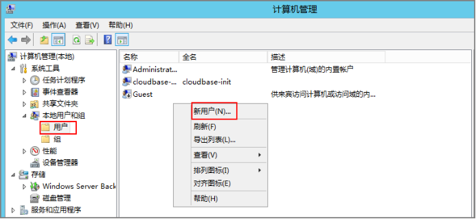 - 選擇“系統工具 > 本地用戶和組 > 用戶”,在右側空白處右擊,并選擇“新用戶”。