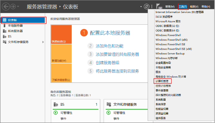 - 在“服務器管理器”中,選擇“儀表板 > 工具 > 計算機管理”。