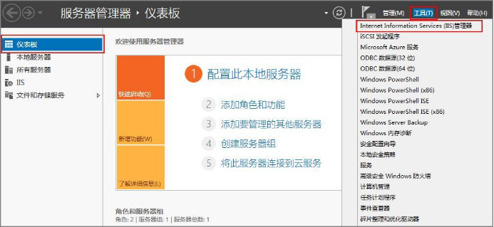 1)在“服務器管理器”中,選擇“儀表板 > 工具 > Internet Information Services (IIS)管理器 ”。