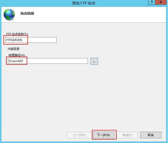 - 在彈出的窗口中,填寫FTP站點名稱及共享文件夾的物理路徑,然后單擊“下一步”。此處站點名稱以“FTPSERVER”為例。