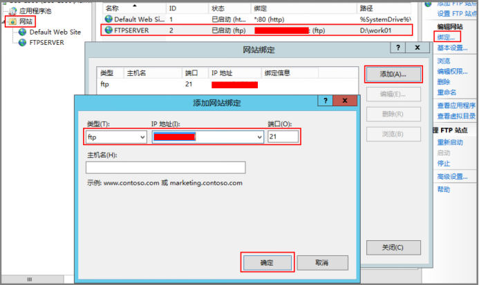 - 綁定彈性云主機的私網IP。選擇“網站”,選中創建的FTP站點,單擊“綁定”;在彈出的“網站綁定”窗口單擊“添加”,然后在彈出的窗口中添加彈性云主機的私網IP地址,并單擊“確定”。