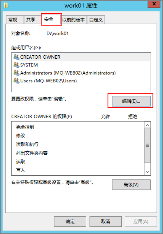 - 在“安全”頁簽,選擇 “Everyone”,單擊“編輯”。如果沒有“Everyone”用戶可以直接選擇,需要先進行添加。