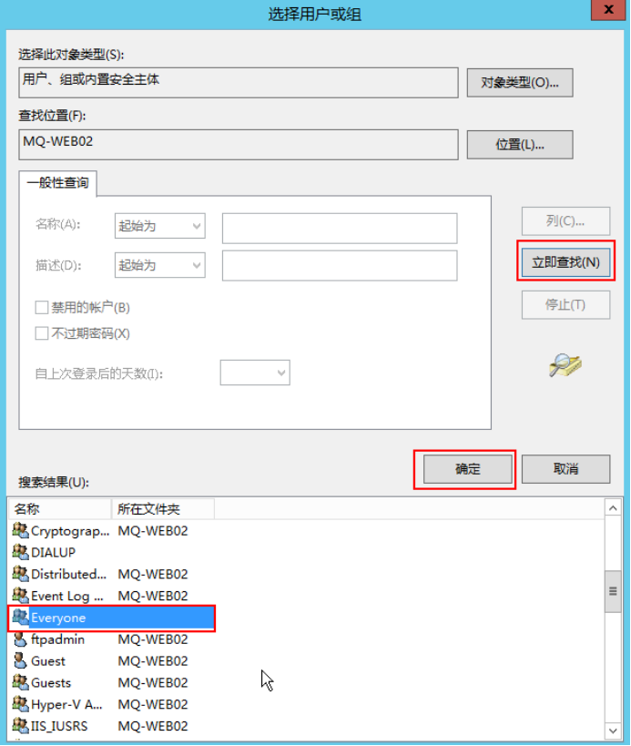 - 在新彈出的窗口中,單擊“立即查找(N)”,然后在搜索結果中選擇“Everyone”并單擊“確定”。