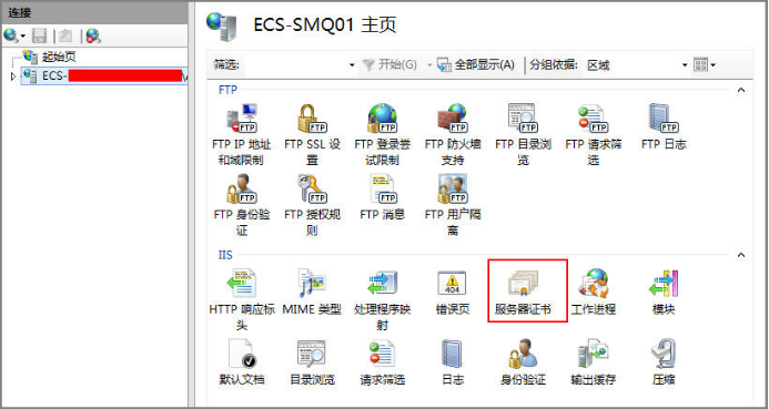 2)在左側列表單擊服務器,然后在服務器主頁“IIS”區域,雙擊“服務器證書”,進入“服務器證書”頁面。