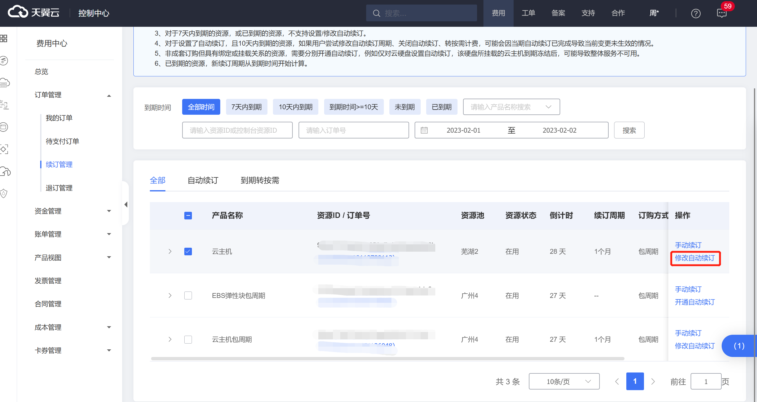 步驟2 在資源頁面找到待修改自動續訂的資源,單擊操作列的“修改自動續訂”。