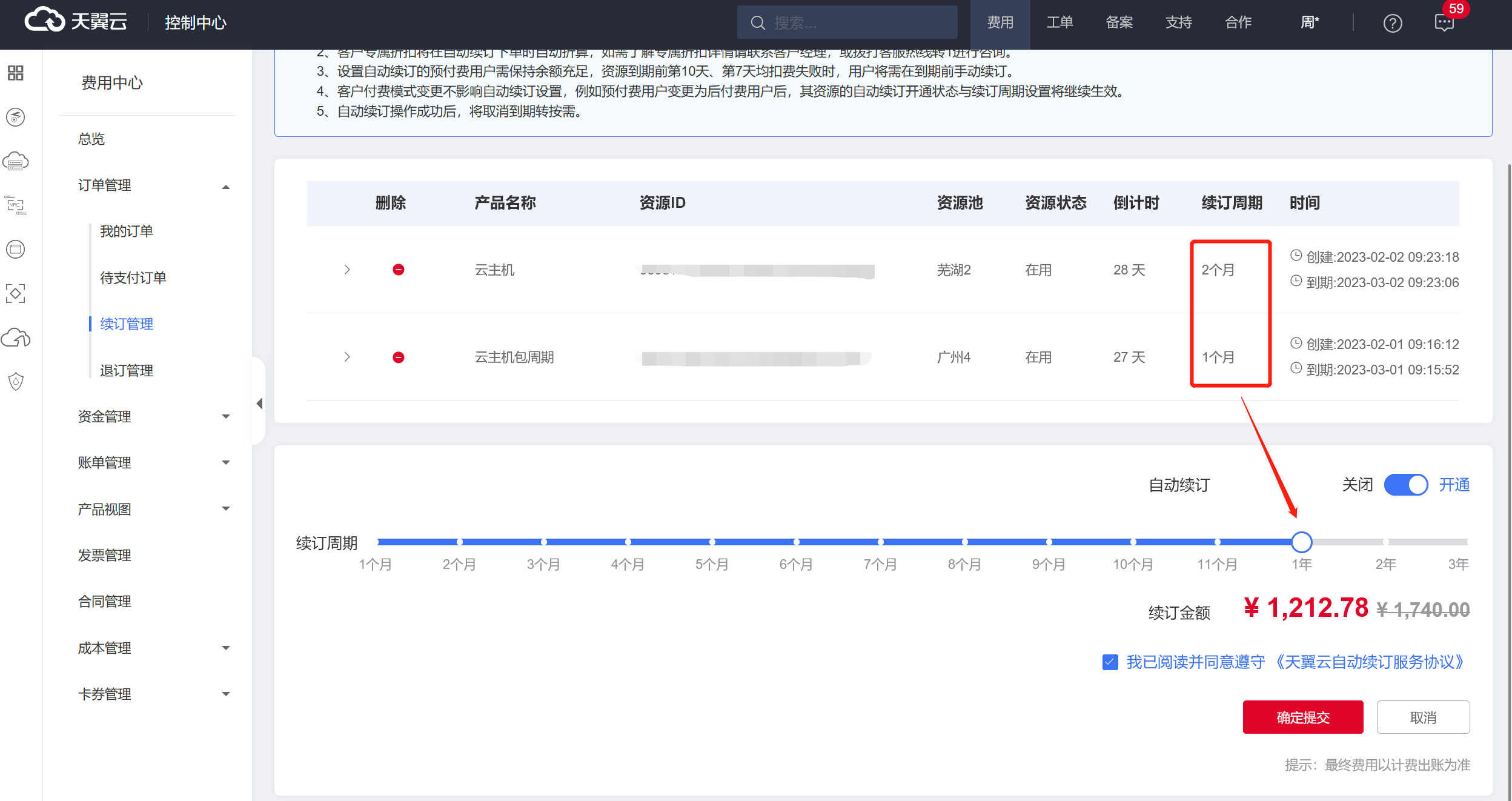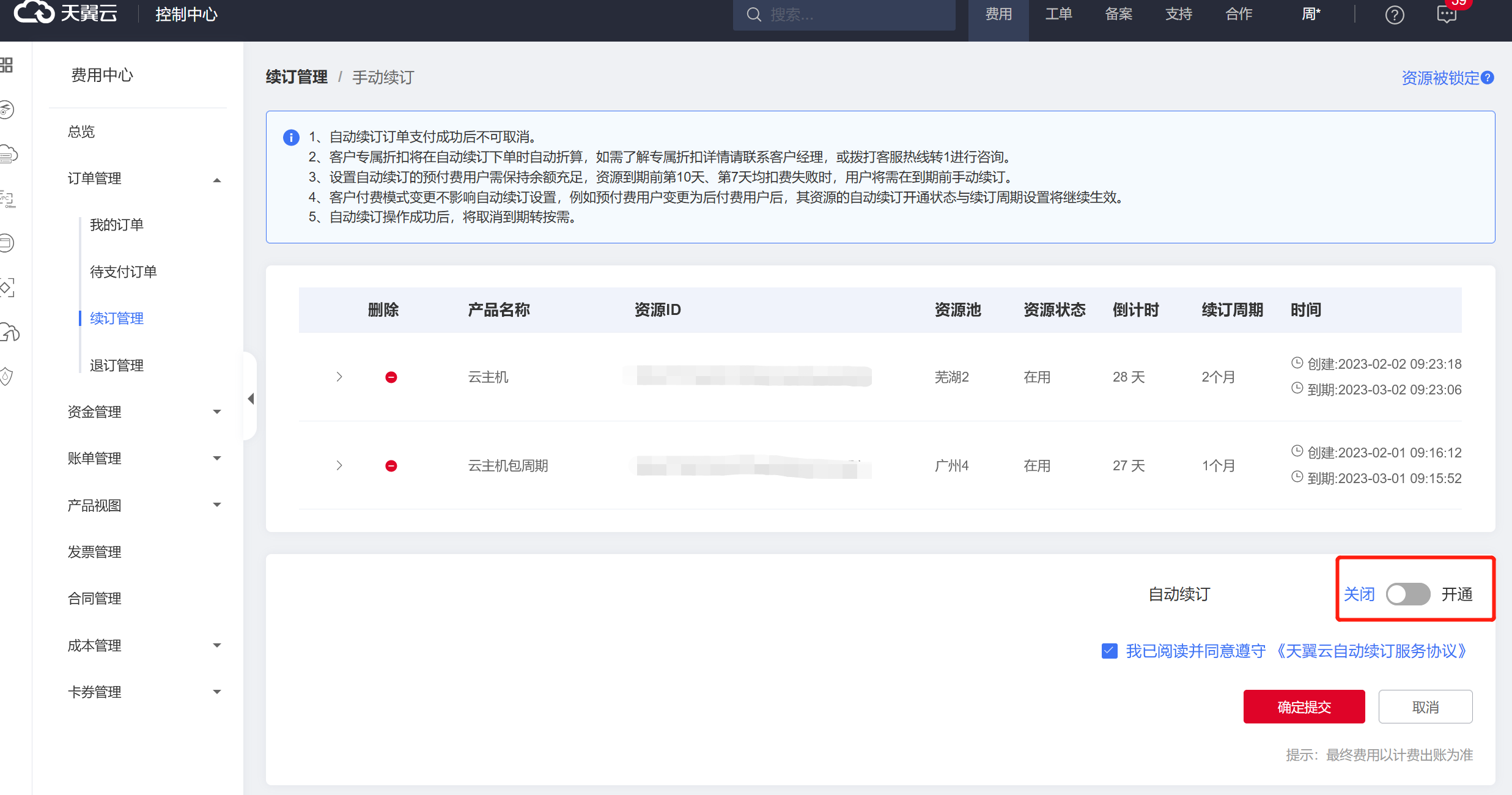 步驟3 點擊“自動續訂”后方的關閉/開通按鈕,單擊“確定提交”。