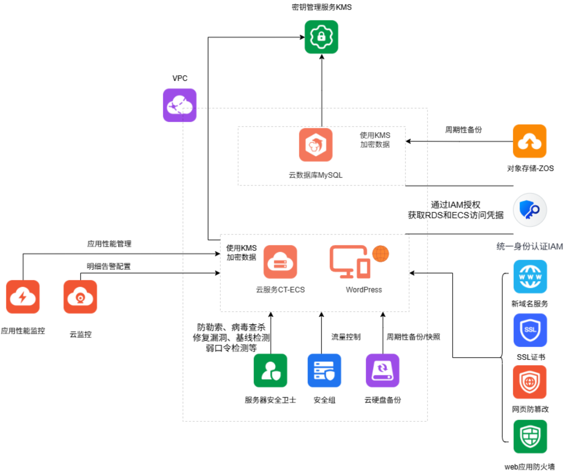 在云服務器CT-ECS中部署WordPress使用的安全架構如下。