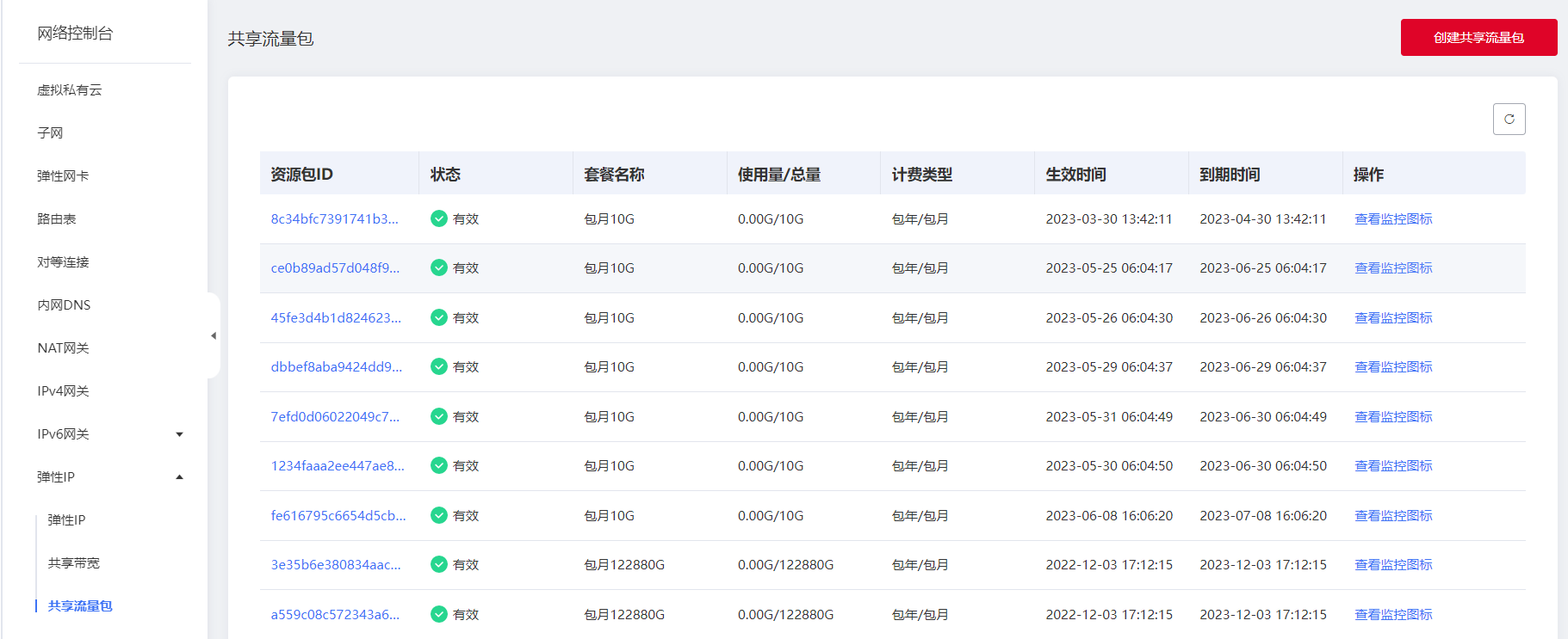 進入網絡控制臺-共享流量包列表頁面,可查看已購買流量包信息,流量包總量、流量包剩余量、到期時間等信息。
