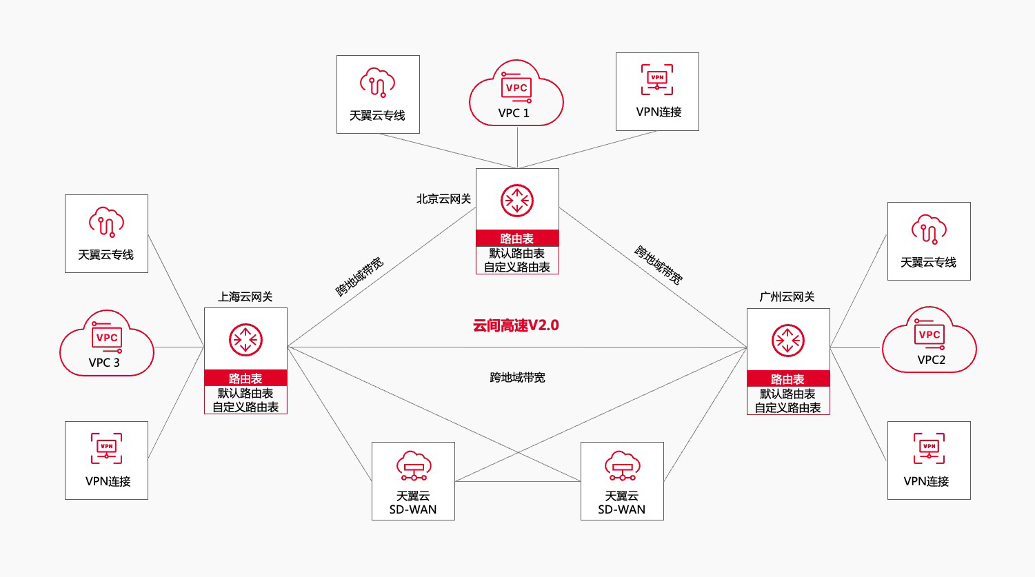 通過云間高速產品,可以實現與云專線、SD-WAN等產品的多種類、多數量網絡互連,配置靈活,實現客戶全部站點的網絡互通,安全訪問所有業務資源。