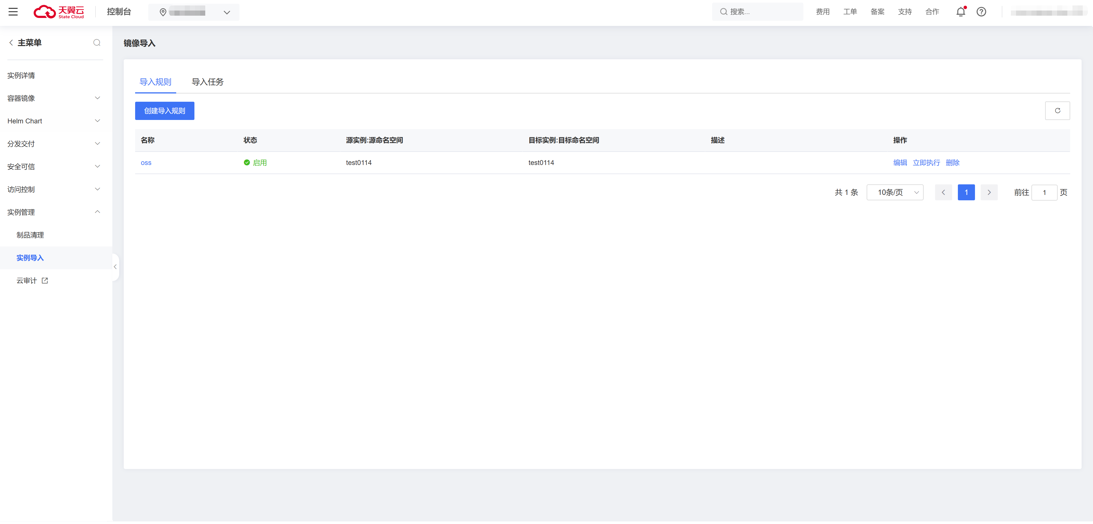 左側(ce)導航欄點(dian)擊(ji) "實例(li)管理(li)" - "鏡像導入",選擇鏡像導入規則并點(dian)擊(ji)立即(ji)執行(xing)按鈕